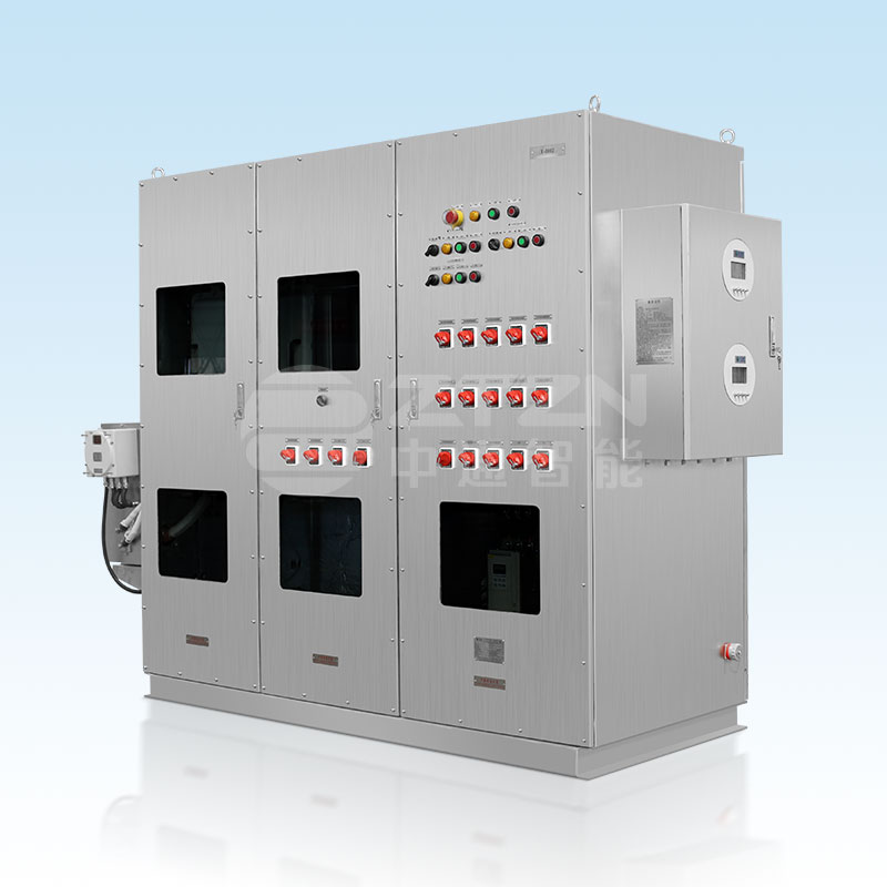 配电柜在自动控制系统的控制下,通入保护气体,正压腔内压力高于正压腔外的压力,形成微正压的安全小环境,从而阻止了可燃性危险气体进入正压腔内,保证内装普通仪表和电器元件的安全运行。